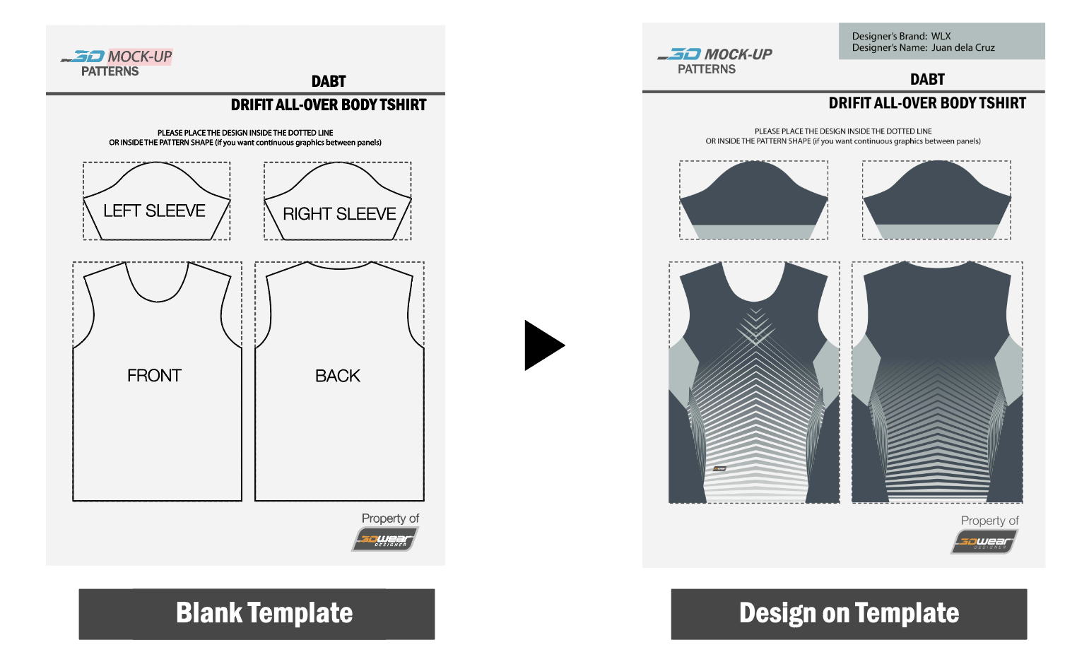 1. Since Merch Cluster 2 is full-body print, upload the graphics positioned inside the 2D pattern or template. See sample below.