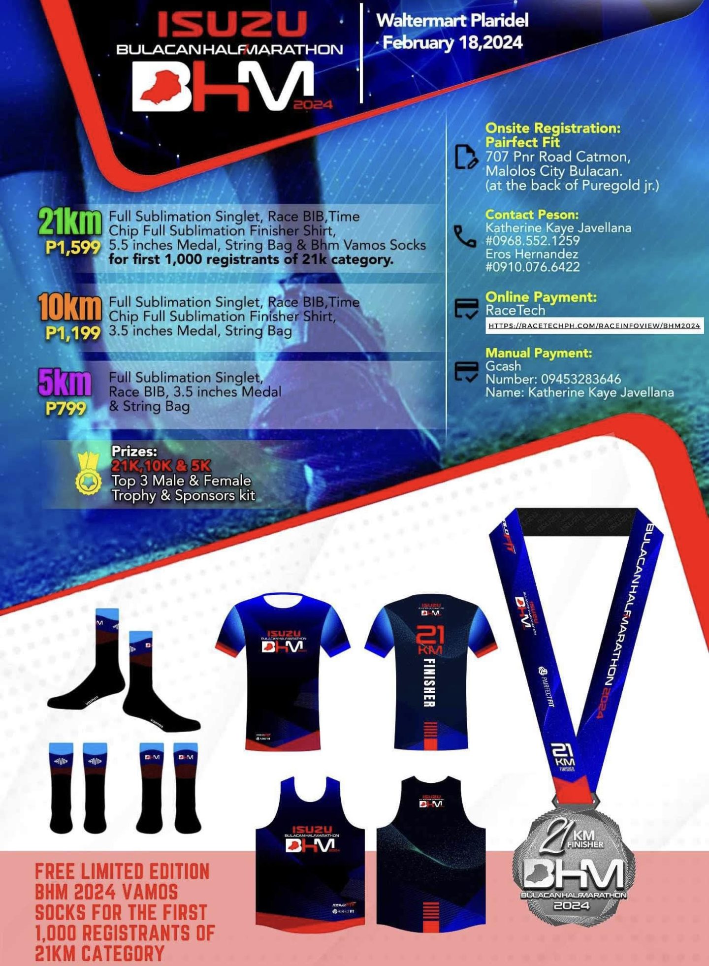 The Bulacan Half Marathon gained remarkable attention in 2020, selling out and rewarding participants with a stunning 5-inch medal. This year, the organizing team and their generous sponsors have elevated the event, offering enticing entitlements, exclusive giveaways, special promotions, and a meticulously planned course. Runners in the 21-kilometer category will embark on a journey from Waltermart Plaridel, traverse the Plaridel-Bustos road, make a U-turn at San Pedro Bustos in Bulacan, and return to the starting point. While the course may appear straightforward, the Bulacan Half Marathon ensures a memorable experience for all, complete with hydration and food stations along the route. Additionally, over 20 photographers will be stationed to capture these unforgettable moments. Don’t miss out on this unparalleled racing experience in Bulacan. Register today and be among the first 1,000 participants in the 21km category to receive limited-edition BHM 2024 socks by Vamos! Bulacan Half Marathon Registration Fees: 10K – P1,199 5K – P799 Registration Venues: