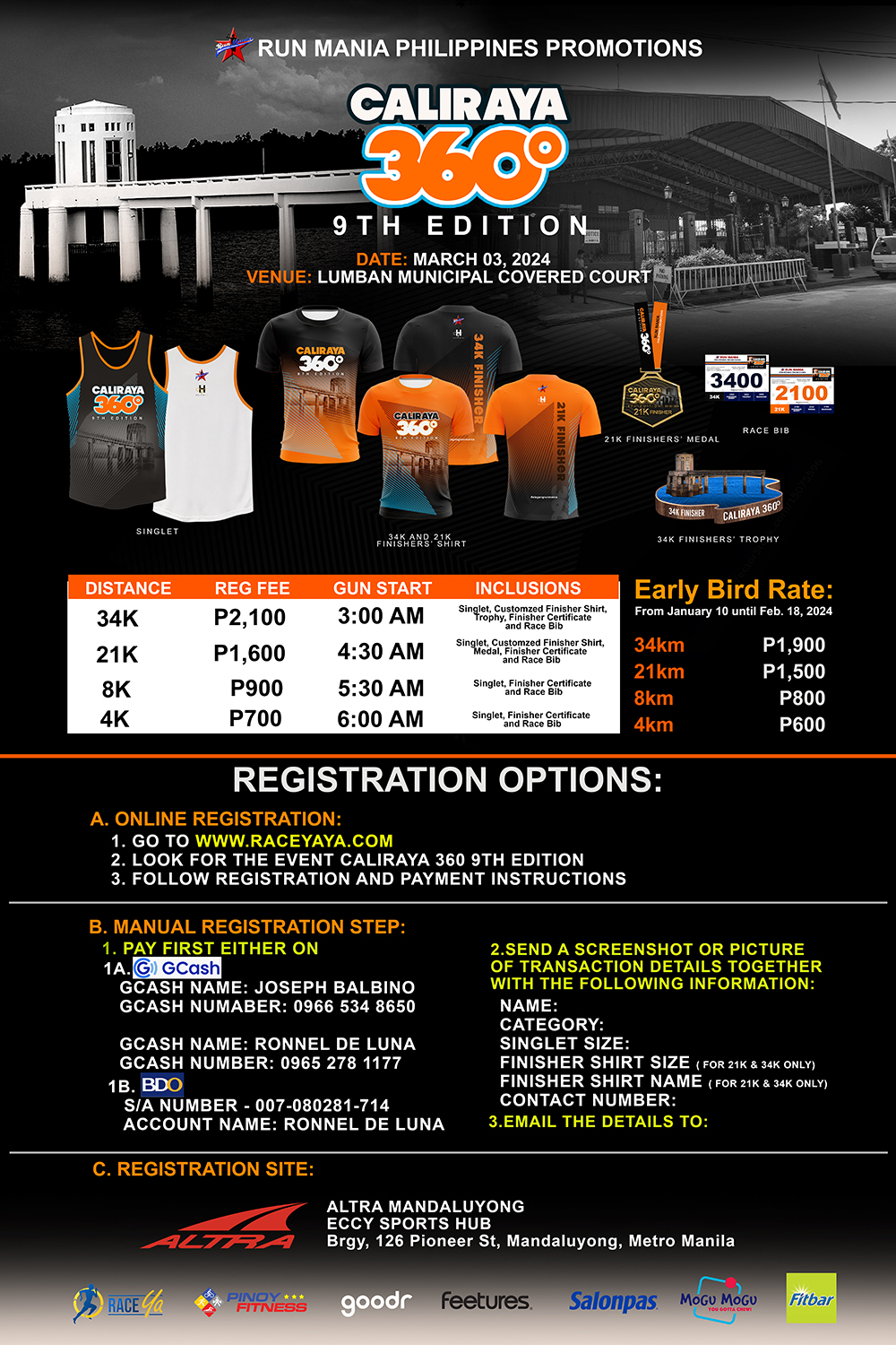 - Register online via – https://register.raceya.fit/event/caliraya360-9th-edition