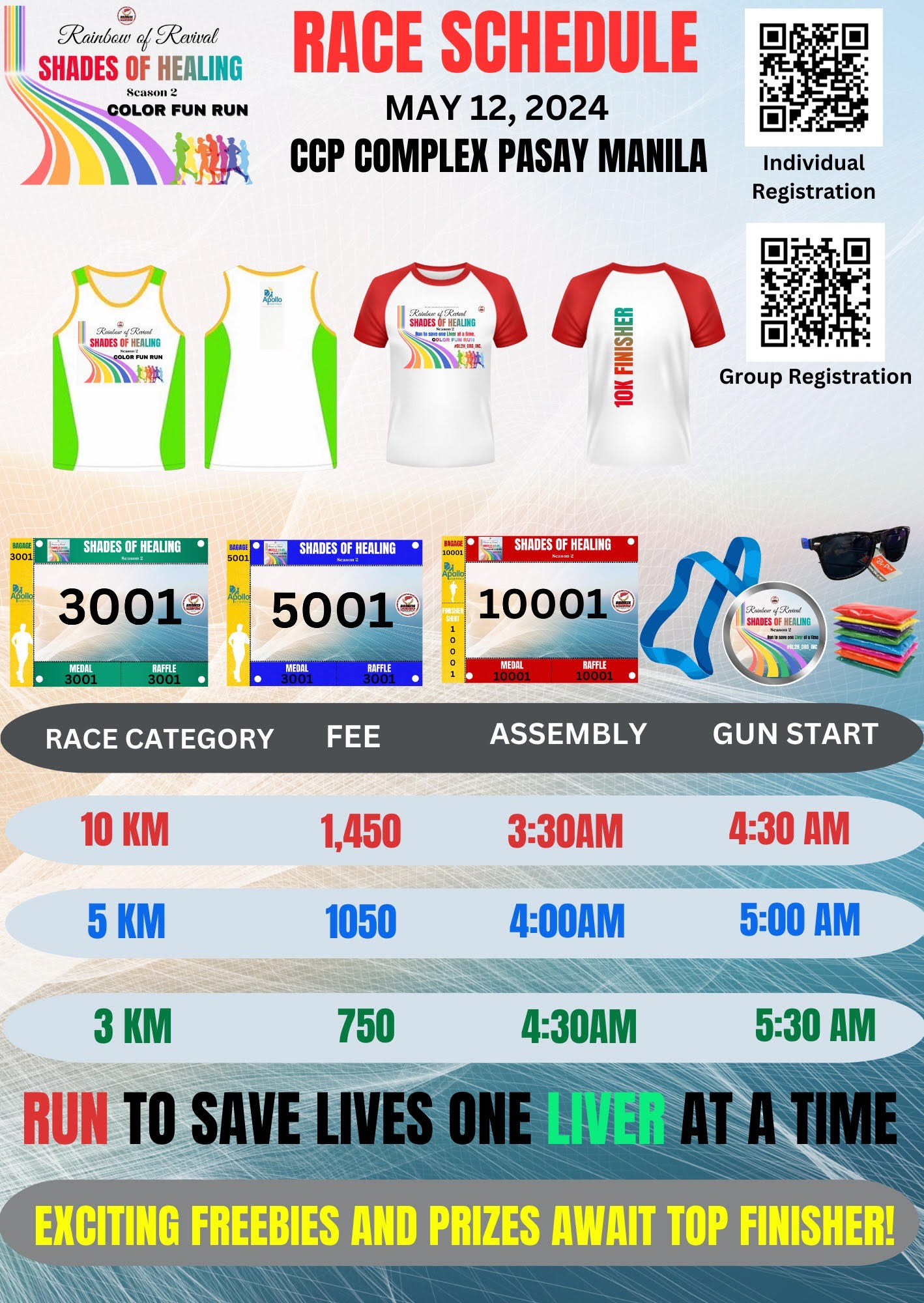 Join the vibrant and heartwarming journey at the “Color Fun Run: Rainbow of Revival, Shades of Healing Season 2” on May 12, 2024, at Liwasang Ulalim in the CCP Complex, Pasay, Manila. This inspiring event, hosted by the Briseis Liver2hold Organizations Inc., aims to offer life-changing support to Filipino babies battling liver disease. Participants will immerse themselves in a colorful and exhilarating run, symbolizing hope and unity in the fight against liver disease. With each stride and splash of color, runners contribute to a noble cause: providing life-saving liver transplants and a chance for healthier lives to these brave little warriors. Be part of this transformative experience that blends fitness, fun, and philanthropy, as we come together to make a lasting impact on the lives of these courageous babies. Rainbow of Revival Shades of Healing Registration Fees: 5K – P1050 10K – P1450 Registration Venues: For More Information: ![]() |